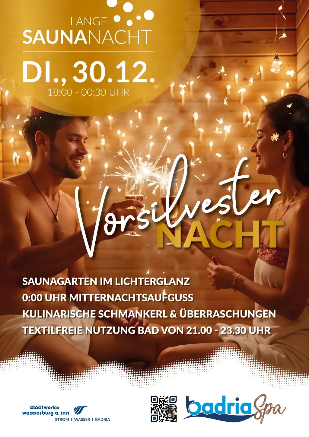 Von 21:00 bis 23:30 Uhr steht Dir das gesamte Bad textilfrei zur Verfügung – eine exklusive Gelegenheit, das Badria in wohliger Entspanntheit zu genießen. Um Mitternacht erwartet Dich ein besonderer Mitternachtsaufguss, der Dich auf das neue Jahr einstimmt. Die Sauna schließt um 00:30 Uhr.
